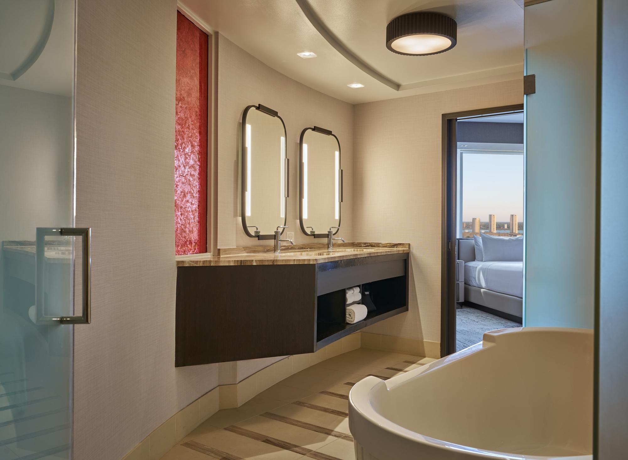 Luxuriate and relax in our spacious Executive King guest room with premium city views. The Executive King guest room includes a living room area equipped with a 50" HD TV, separate private bedroom area with a 50" HD TV, upgraded full bath with a luxurious garden tub, dual rain-head with triple body wash shower and wired internet hookup access, climate controls, daily housekeeping upon request and in-room dining for your convenience.